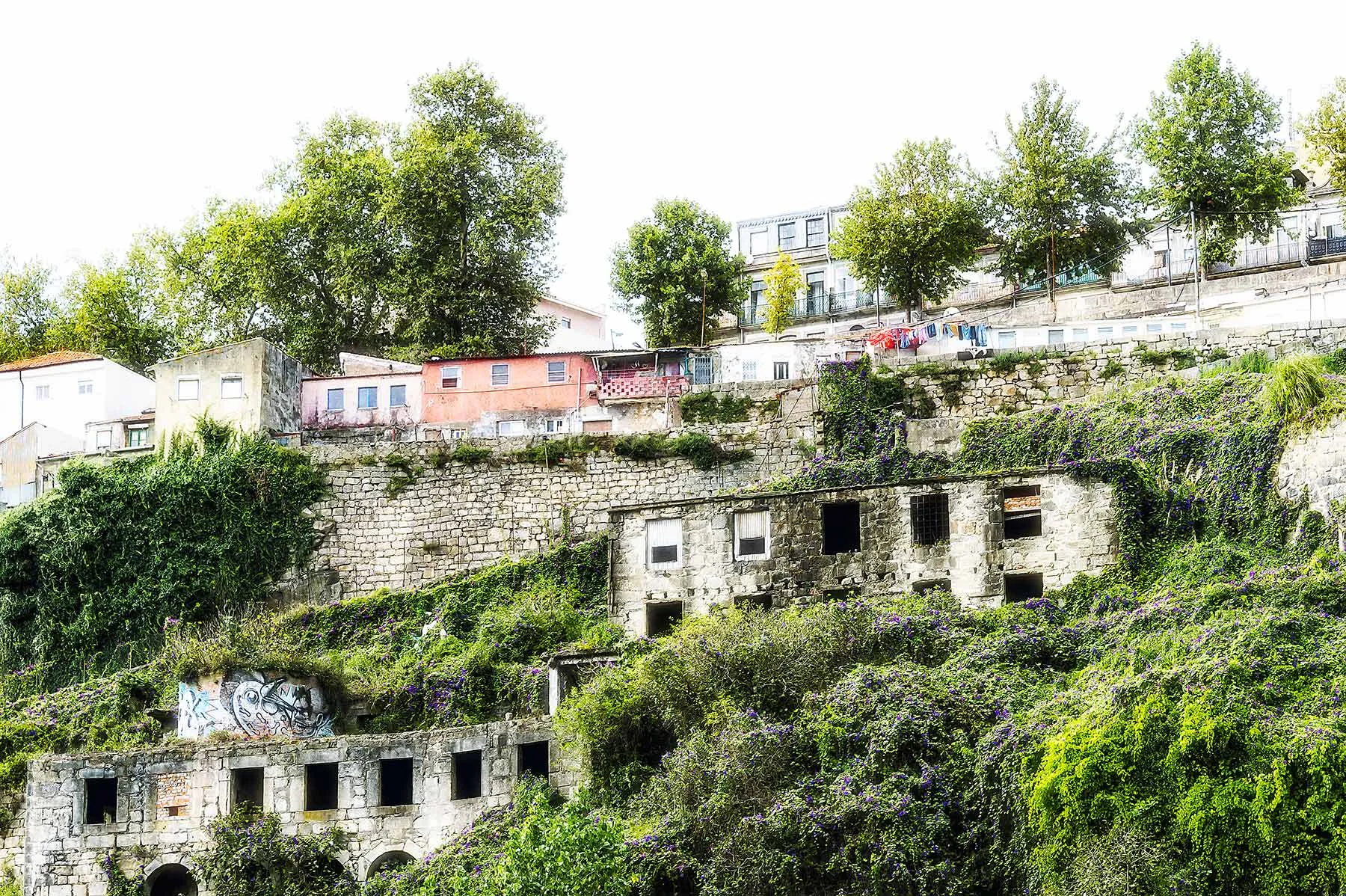 Stone wall, tree growing out of tile roof, Sault, France (Provence re-interpretation) 2020